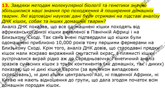 Завдяки методам молекулярної біології та генетики значно збільшилися наші знання про походження й поширення домашніх тварин. Які відповідні наукові дані були отримані на підставі аналізу ДНК кішок, собак та інших домашніх тварин? Аналіз ДНК показав, що все одомашнені кішки походять від африканської дикої кішки виявленої в Північній Африці і на Близькому Сході. Так само вчені підтвердили що кішки були одомашнені приблизно 10,000 років тому першими фермерами на Близькому Сході. Крім того, аналіз ДНК довів, що стародавні предки кішок мали яскраво виражений смугастий окрас, а плямисті кішки зустрічалися вкрай рідко аж до Середньовіччя. Генетичний аналіз зразків сучасних кішок з трьох континентів (як домашніх, так і диких) показав, що ні дикі кішки Європи (за винятком випадкових схрещувань), ні дикі кішки центральної Азії, ні південної Африки, ні Китаю не мають відношення до групи, що дала згодом початок всім домашнім породам кішок.