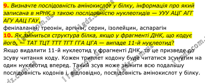 9. Визначте послідовність амінокислот у білку, інформація про який записана в мРНК з такою послідовністю нуклеотидів — УУУ АЦГ АГГ АГУ ААЦ ГАУ. фенілаланін, треонін, аргінін, серин, ізолейцин, аспарагін 10. Як зміниться структура білка, якщо у фрагменті ДНК, що кодує його, — ТАТ ТЦТ ТТТ ТГТ ГГА ЦГА — випаде 11-й нуклеотид? Якщо видалити 11-й нуклеотид у фрагменті ДНК, то це призведе до зсуву читання коду. Кожен триплет кодону буде читатися зсунутим на один нуклеотид вперед. Такий зсув може змінити всю подальшу послідовність кодонів і, відповідно, послідовність амінокислот у білку.