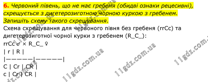 Червоний півень, що не має гребеня (обидві ознаки рецесивні), схрещується з дигетерозиготною чорною куркою з гребенем. Запишіть схему такого схрещування. Схема схрещування для червоного півня без гребеня (rrCc) та дигетерозиготної чорної курки з гребенем (R_C_): rrCc ♂ × R_C_ ♀ | r | R | |—————|—————| C | Cr | CR | c | Cr | CR |