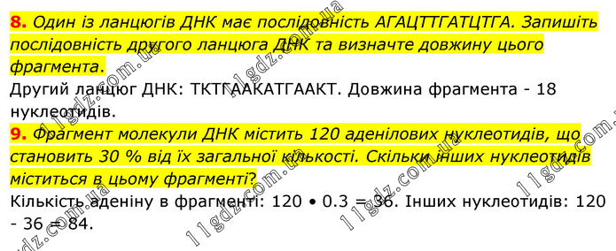 8. Один із ланцюгів ДНК має послідовність АГАЦТТГАТЦТГА. Запишіть послідовність другого ланцюга ДНК та визначте довжину цього фрагмента. Другий ланцюг ДНК: ТКТГААКАТГААКТ. Довжина фрагмента - 18 нуклеотидів. 9. Фрагмент молекули ДНК містить 120 аденілових нуклеотидів, що становить 30 % від їх загальної кількості. Скільки інших нуклеотидів міститься в цьому фрагменті? Кількість аденіну в фрагменті: 120 • 0.3 = 36. Інших нуклеотидів: 120 - 36 = 84.