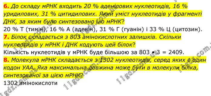 6. До складу мРНК входить 20 % аденілових нуклеотидів, 16 % уридилових, 31 % цитидилових. Який уміст нуклеотидів у фрагменті ДНК, за яким було синтезовано цю мРНК? 20 % Т (тимін), 16 % А (аденін), 31 % Г (гуанін) і 33 % Ц (цитозин). 7. Білок складається з 803 амінокислотних залишків. Скільки нуклеотидів у мРНК і ДНК кодують цей білок? Кількість нуклеотидів у мРНК буде більшою за 803 • 3 = 2409. 8. Молекула мРНК складається з 1302 нуклеотидів, серед яких є один кодон УАА. Яка максимальна довжина може бути в молекули білка, синтезованої за цією мРНК? 1302 амінокислоти