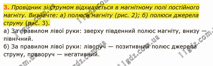 Провідник зі струмом відхиляється в магнітному полі постійного магніту. Визначте: а) полюси магніту (рис. 2); б) полюси джерела струму (рис. 3). а) За правилом лівої руки: зверху південний полюс магніту, внизу — північний. б) За правилом лівої руки: ліворуч — позитивний полюс джерела струму, праворуч — негативний.
