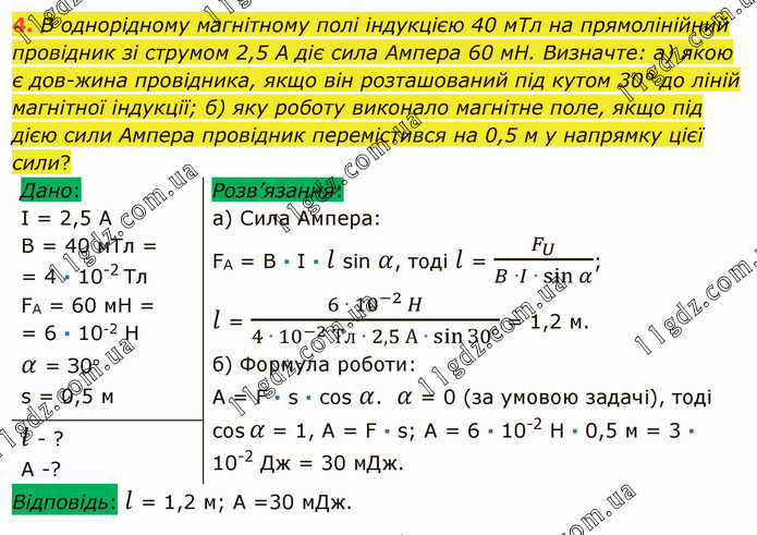 В однорідному магнітному полі індукцією 40 мТл на прямолінійний провідник зі струмом 2,5 А діє сила Ампера 60 мН. Визначте: а) якою є довжина провідника, якщо він розташований під кутом 30° до ліній магнітної індукції; б) яку роботу виконало магнітне поле, якщо під дією сили Ампера провідник перемістився на 0,5 м у напрямку цієї сили?