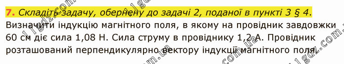 Складіть задачу, обернену до задачі 2, поданої в пункті 3 § 4. Визначити індукцію магнітного поля, в якому на провідник завдовжки 60 см діє сила 1,08 Н. Сила струму в провіднику 1,2 А. Провідник розташований перпендикулярно вектору індукції магнітного поля.