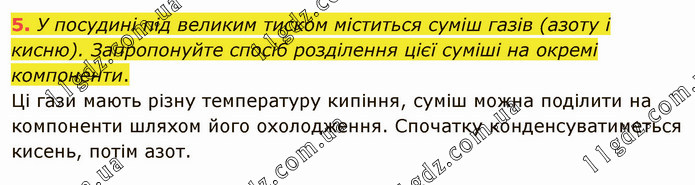 У посудині під великим тиском міститься суміш газів (азоту і кисню). Запропонуйте спосіб розділення цієї суміші на окремі компоненти. Ці гази мають різну температуру кипіння, суміш можна поділити на компоненти шляхом його охолодження. Спочатку конденсуватиметься кисень, потім азот.