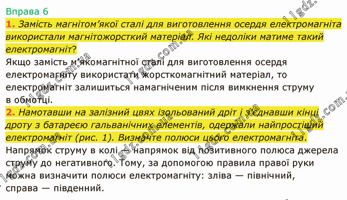 Замість магнітом’якої сталі для виготовлення осердя електромагніта використали магнітожорсткий матеріал. Які недоліки матиме такий електромагніт? Якщо замість м’якомагнітної сталі для виготовлення осердя електромагніту використати жорсткомагнітний матеріал, то електромагніт залишиться намагніченим після вимкнення струму в обмотці. 2. Намотавши на залізний цвях ізольований дріт і з’єднавши кінці дроту з батареєю гальванічних елементів, одержали найпростіший електромагніт (рис. 1). Визначте полюси цього електромагніта. Напрямок струму в колі — напрямок від позитивного полюса джерела струму до негативного. Тому, за допомогою правила правої руки можна визначити полюси електромагніту: зліва — північний, справа — південний.
