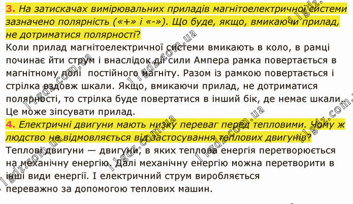 На затискачах вимірювальних приладів магнітоелектричної системи зазначено полярність («+» і «-»). Що буде, якщо, вмикаючи прилад, не дотриматися полярності? Коли прилад магнітоелектричної системи вмикають в коло, в рамці починає йти струм і внаслідок дії сили Ампера рамка повертається в магнітному полі постійного магніту. Разом із рамкою повертається і стрілка вздовж шкали. Якщо, вмикаючи прилад, не дотриматися полярності, то стрілка буде повертатися в інший бік, де немає шкали. Це може зіпсувати прилад. 4. Електричні двигуни мають низку переваг перед тепловими. Чому ж людство не відмовляється від застосування теплових двигунів? Теплові двигуни — двигуни, в яких теплова енергія перетворюється на механічну енергію. Далі механічну енергію можна перетворити в інші види енергії. І електричний струм виробляється переважно за допомогою теплових машин.