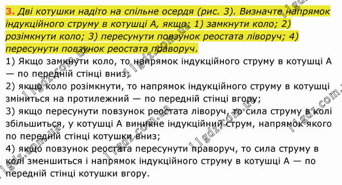 Дві котушки надіто на спільне осердя (рис. 3). Визначте напрямок індукційного струму в котушці А, якщо: 1) замкнути коло; 2) розімкнути коло; 3) пересунути повзунок реостата ліворуч; 4) пересунути повзунок реостата праворуч. 1) Якщо замкнути коло, то напрямок індукційного струму в котушці А — по передній стінці вниз; 2) якщо коло розімкнути, то напрямок індукційного струму в котушці зміниться на протилежний — по передній стінці вгору; 3) якщо пересунути повзунок реостата ліворуч, то сила струму в колі збільшиться, у котушці А виникне індукційний струм, напрямок якого по передній стінці котушки вниз; 4) якщо повзунок реостата пересунути праворуч, то сила струму в колі зменшиться і напрямок індукційного струму в котушці А — по передній стінці котушки вгору.