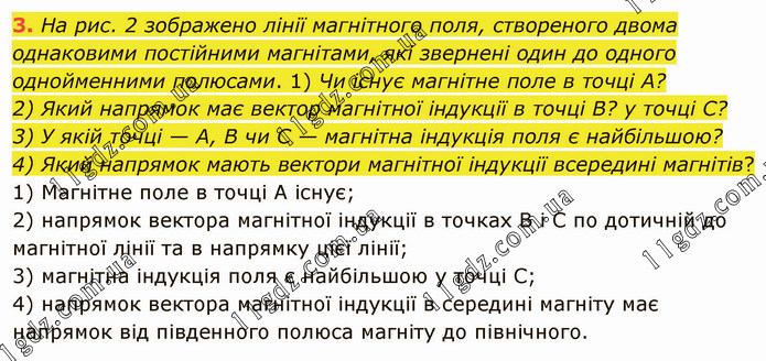 На рис. 2 зображено лінії магнітного поля, створеного двома однаковими постійними магнітами, які звернені один до одного однойменними полюсами. 1) Чи існує магнітне поле в точці А? 2) Який напрямок має вектор магнітної індукції в точці В? у точці С? 3) У якій точці — А, В чи С — магнітна індукція поля є найбільшою? 4) Який напрямок мають вектори магнітної індукції всередині магнітів? 1) Магнітне поле в точці А існує; 2) напрямок вектора магнітної індукції в точках В і С по дотичній до магнітної лінії та в напрямку цієї лінії; 3) магнітна індукція поля є найбільшою у точці С; 4) напрямок вектора магнітної індукції в середині магніту має напрямок від південного полюса магніту до північного.