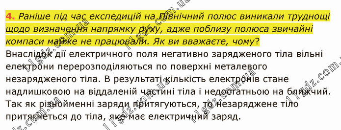 Раніше під час експедицій на Північний полюс виникали труднощі щодо визначення напрямку руху, адже поблизу полюса звичайні компаси майже не працювали. Як ви вважаєте, чому? Внаслідок дії електричного поля негативно зарядженого тіла вільні електрони перерозподіляються по поверхні металевого незарядженого тіла. В результаті кількість електронів стане надлишковою на віддаленій частині тіла і недостатньою на ближчий. Так як різнойменні заряди притягуються, то незаряджене тіло притягнеться до тіла, яке має електричний заряд.