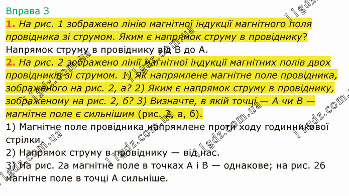 На рис. 1 зображено лінію магнітної індукції магнітного поля провідника зі струмом. Яким є напрямок струму в провіднику? Напрямок струму в провіднику від В до А. 2. На рис. 2 зображено лінії магнітної індукції магнітних полів двох провідників зі струмом. 1) Як напрямлене магнітне поле провідника, зображеного на рис. 2, а? 2) Яким є напрямок струму в провіднику, зображеному на рис. 2, б? 3) Визначте, в якій точці — А чи В — магнітне поле є сильнішим (рис. 2, а, б). 1) Магнітне поле провідника напрямлене проти ходу годинникової стрілки. 2) Напрямок струму в провіднику — від нас. 3) На рис. 2а магнітне поле в точках А і В — однакове; на рис. 26 магнітне поле в точці А сильніше.