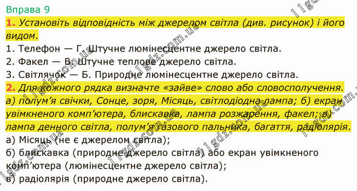 Установіть відповідність між джерелом світла (див. рисунок) і його видом. 1. Телефон — Г. Штучне люмінесцентне джерело світла. 2. Факел — В. Штучне теплове джерело світла. 3. Світлячок — Б. Природне люмінесцентне джерело світла. 2. Для кожного рядка визначте «зайве» слово або словосполучення. а) полум’я свічки, Сонце, зоря, Місяць, світлодіодна лампа; б) екран увімкненого комп’ютера, блискавка, лампа розжарення, факел; в) лампа денного світла, полум’я газового пальника, багаття, радіолярія. а) Місяць (не є джерелом світла); б) блискавка (природне джерело світла) або екран увімкненого комп’ютера (люмінесцентне джерело світла); в) радіолярія (природне джерело світла).