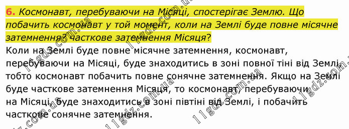 Космонавт, перебуваючи на Місяці, спостерігає Землю. Що побачить космонавт у той момент, коли на Землі буде повне місячне затемнення? часткове затемнення Місяця? Коли на Землі буде повне місячне затемнення, космонавт, перебуваючи на Місяці, буде знаходитись в зоні повної тіні від Землі, тобто космонавт побачить повне сонячне затемнення. Якщо на Землі буде часткове затемнення Місяця, то космонавт, перебуваючи на Місяці, буде знаходитись в зоні півтіні від Землі, і побачить часткове сонячне затемнення.