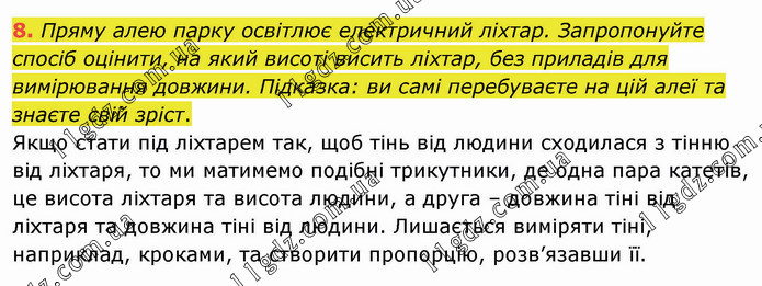 Пряму алею парку освітлює електричний ліхтар. Запропонуйте спосіб оцінити, на який висоті висить ліхтар, без приладів для вимірювання довжини. Підказка: ви самі перебуваєте на цій алеї та знаєте свій зріст. Якщо стати під ліхтарем так, щоб тінь від людини сходилася з тінню від ліхтаря, то ми матимемо подібні трикутники, де одна пара катетів, це висота ліхтаря та висота людини, а друга – довжина тіні від ліхтаря та довжина тіні від людини. Лишається виміряти тіні, наприклад, кроками, та створити пропорцію, розв’язавши її.