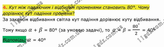 Кут між падаючим і відбитим променями становить 80°. Чому дорівнює кут падіння променя? За законом відбивання світла кут падіння дорівнює куту відбивання. Тому якщо α + β = 80° (за умовою задачі), то α = β = 80^°/2 = 40° Відповідь: α = 40°