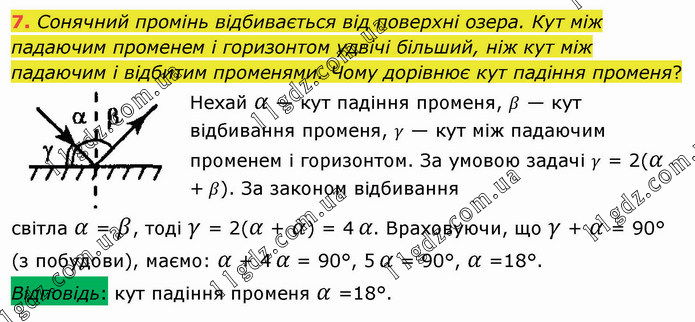 Сонячний промінь відбивається від поверхні озера. Кут між падаючим променем і горизонтом удвічі більший, ніж кут між падаючим і відбитим променями. Чому дорівнює кут падіння променя? Нехай α — кут падіння променя, β — кут відбивання променя, γ — кут між падаючим променем і горизонтом. За умовою задачі γ = 2(α + β). За законом відбивання світла α = β, тоді γ = 2(α + α) = 4 α. Враховуючи, що γ + α = 90° (з побудови), маємо: α + 4 α = 90°, 5 α = 90°, α =18°. Відповідь: кут падіння променя α =18°.