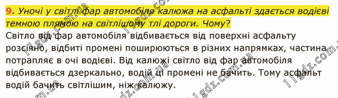 Уночі у світлі фар автомобіля калюжа на асфальті здається водієві темною плямою на світлішому тлі дороги. Чому? Світло від фар автомобіля відбивається від поверхні асфальту розсіяно, відбиті промені поширюються в різних напрямках, частина потрапляє в очі водієві. Від калюжі світло від фар автомобіля відбивається дзеркально, водій ці промені не бачить. Тому асфальт водій бачить світлішим, ніж калюжу.
