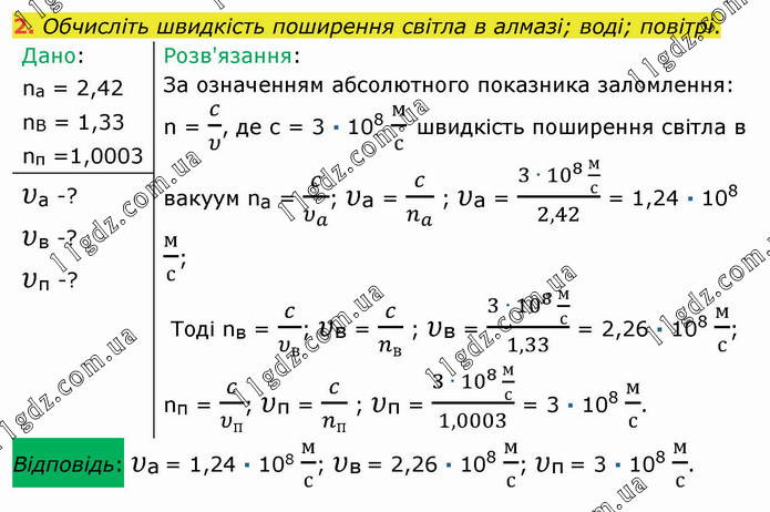 Обчисліть швидкість поширення світла в алмазі; воді; повітрі.