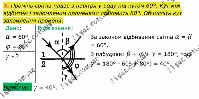 Промінь світла падає з повітря у воду під кутом 60°. Кут між відбитим і заломленим променями становить 80°. Обчисліть кут заломлення променя.