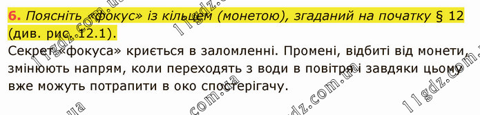 Поясніть «фокус» із кільцем (монетою), згаданий на початку § 12 (див. рис. 12.1). Секрет «фокуса» криється в заломленні. Промені, відбиті від монети, змінюють напрям, коли переходять з води в повітря і завдяки цьому вже можуть потрапити в око спостерігачу.