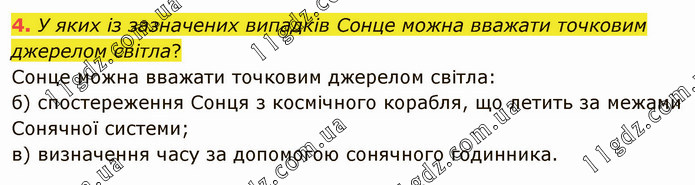У яких із зазначених випадків Сонце можна вважати точковим джерелом світла? Сонце можна вважати точковим джерелом світла: б) спостереження Сонця з космічного корабля, що летить за межами Сонячної системи; в) визначення часу за допомогою сонячного годинника.