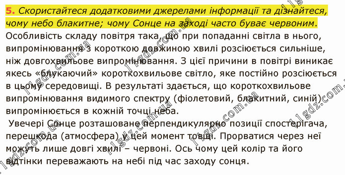 Скористайтеся додатковими джерелами інформації та дізнайтеся, чому небо блакитне; чому Сонце на заході часто буває червоним. Особливість складу повітря така, що при попаданні світла в нього, випромінювання з короткою довжиною хвилі розсіюється сильніше, ніж довгохвильове випромінювання. З цієї причини в повітрі виникає якесь «блукаючий» короткохвильове світло, яке постійно розсіюється в цьому середовищі. В результаті здається, що короткохвильове випромінювання видимого спектру (фіолетовий, блакитний, синій) випромінюється в кожній точці неба. Увечері Сонце розташоване перпендикулярно позиції спостерігача, перешкода (атмосфера) у цей момент товщі. Прорватися через неї можуть лише довгі хвилі – червоні. Ось чому цей колір та його відтінки переважають на небі під час заходу сонця.