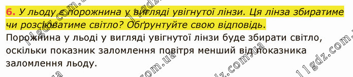 У льоду є порожнина у вигляді увігнутої лінзи. Ця лінза збиратиме чи розсіюватиме світло? Обґрунтуйте свою відповідь. Порожнина у льоді у вигляді увігнутої лінзи буде збирати світло, оскільки показник заломлення повітря менший від показника заломлення льоду.