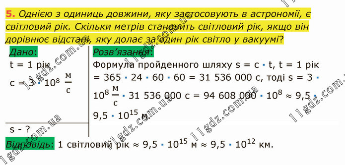 Однією з одиниць довжини, яку застосовують в астрономії, є світловий рік. Скільки метрів становить світловий рік, якщо він дорівнює відстані, яку долає за один рік світло у вакуумі?