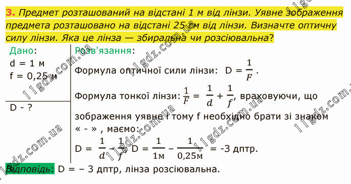 Предмет розташований на відстані 1 м від лінзи. Уявне зображення предмета розташовано на відстані 25 см від лінзи. Визначте оптичну силу лінзи. Яка це лінза — збиральна чи розсіювальна?