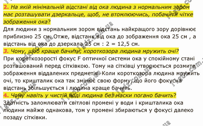 На якій мінімальній відстані від ока людина з нормальним зором має розташувати дзеркальце, щоб, не втомлюючись, побачити чітке зображення ока? Для людини з нормальним зором відстань найкращого зору дорівнює приблизно 25 см. Отже, відстань від ока до зображення ока 25 см , а відстань від ока до дзеркала 25 см : 2 = 12,5 см. 3. Чому, щоб краще бачити, короткозора людина мружить очі? При короткозорості фокус F оптичної системи ока у спокійному стані розташований перед сітківкою. Тому на сітківці утворюється розмите зображення віддалених предметів. Коли короткозора людина мружить очі, то кришталик ока так змінює свою форму, що його фокусна відстань збільшується і людина краще бачить. 4. Чому навіть у чистій воді людина без маски погано бачить? Здатність заломлювати світлові промені у води і кришталика ока людини майже однакова, том у промені збираються у фокусі далеко позаду сітківки.