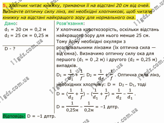 Хлопчик читає книжку, тримаючи її на відстані 20 см від очей. Визначте оптичну силу лінз, які необхідні хлопчикові, щоб читати книжку на відстані найкращого зору для нормального ока.