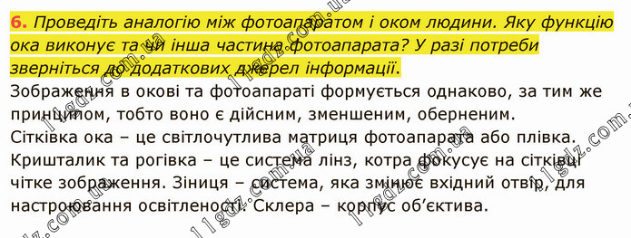 Проведіть аналогію між фотоапаратом і оком людини. Яку функцію ока виконує та чи інша частина фотоапарата? У разі потреби зверніться до додаткових джерел інформації. Зображення в окові та фотоапараті формується однаково, за тим же принципом, тобто воно є дійсним, зменшеним, оберненим. Сітківка ока – це світлочутлива матриця фотоапарата або плівка. Кришталик та рогівка – це система лінз, котра фокусує на сітківці чітке зображення. Зіниця – система, яка змінює вхідний отвір, для настроювання освітленості. Склера – корпус об’єктива.