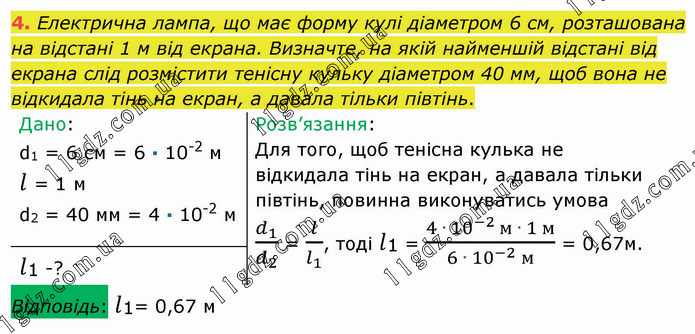 Електрична лампа, що має форму кулі діаметром 6 см, розташована на відстані 1 м від екрана. Визначте, на якій найменшій відстані від екрана слід розмістити тенісну кульку діаметром 40 мм, щоб вона не відкидала тінь на екран, а давала тільки півтінь.