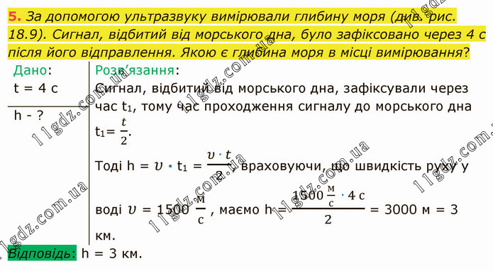 За допомогою ультразвуку вимірювали глибину моря (див. рис. 18.9). Сигнал, відбитий від морського дна, було зафіксовано через 4 с після його відправлення. Якою є глибина моря в місці вимірювання?