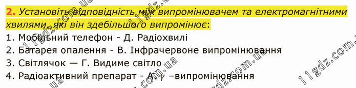 Установіть відповідність між випромінювачем та електромагнітними хвилями, які він здебільшого випромінює: 1. Мобільний телефон - Д. Радіохвилі 2. Батарея опалення - В. Інфрачервоне випромінювання 3. Світлячок — Г. Видиме світло 4. Радіоактивний препарат - А. γ –випромінювання