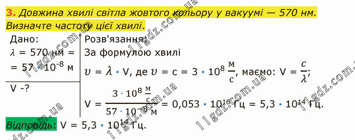 Довжина хвилі світла жовтого кольору у вакуумі — 570 нм. Визначте частоту цієї хвилі.