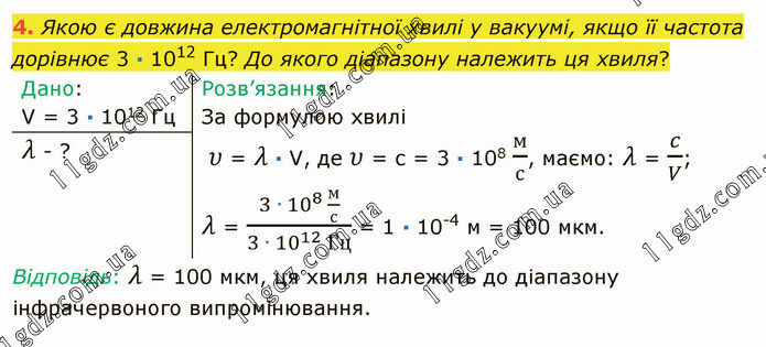 Якою є довжина електромагнітної хвилі у вакуумі, якщо її частота дорівнює 3 ∙ 1012 Гц? До якого діапазону належить ця хвиля?