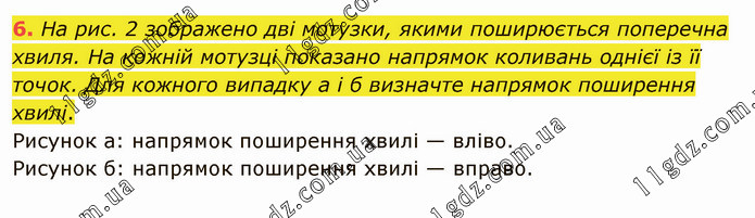 На рис. 2 зображено дві мотузки, якими поширюється поперечна хвиля. На кожній мотузці показано напрямок коливань однієї із її точок. Для кожного випадку а і б визначте напрямок поширення хвилі. Рисунок а: напрямок поширення хвилі — вліво. Рисунок б: напрямок поширення хвилі — вправо.