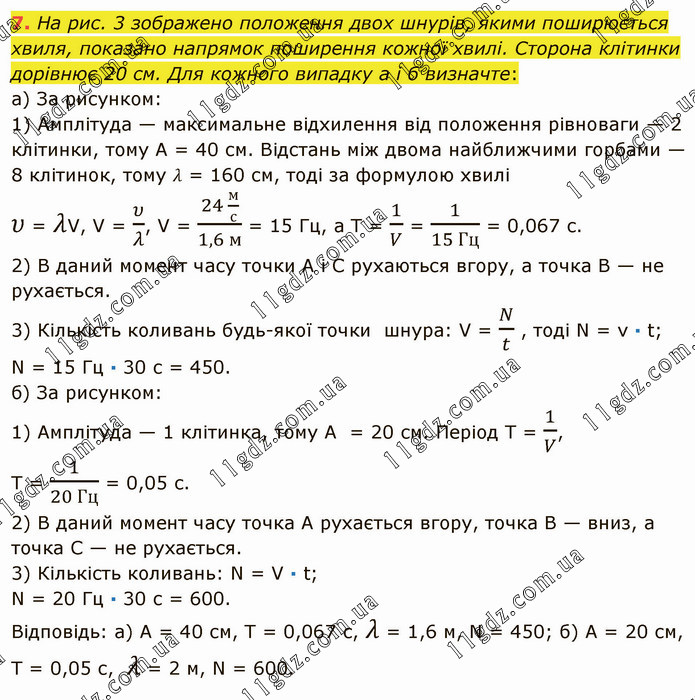 На рис. 3 зображено положення двох шнурів, якими поширюється хвиля, показано напрямок поширення кожної хвилі. Сторона клітинки дорівнює 20 см. Для кожного випадку а і б визначте: а) За рисунком: 1) Амплітуда — максимальне відхилення від положення рівноваги — 2 клітинки, тому А = 40 см. Відстань між двома найближчими горбами — 8 клітинок, тому λ = 160 см, тоді за формулою хвилі υ = λV, V = υ/λ, V = (24 м/с)/(1,6 м) = 15 Гц, а Т = 1/V = 1/(15 Гц) = 0,067 с. 2) В даний момент часу точки А і С рухаються вгору, а точка В — не рухається. 3) Кількість коливань будь-якої точки шнура: V = N/t , тодi N = v ∙ t; N = 15 Гц ∙ 30 с = 450. б) За рисунком: 1) Амплітуда — 1 клітинка, тому А = 20 см. Період T = 1/V, T = 1/(20 Гц) = 0,05 c. 2) В даний момент часу точка A рухається вгору, точка B — вниз, а точка С — не рухається. 3) Кількість коливань: N = V ∙ t; N = 20 Гц ∙ 30 с = 600. Відповідь: а) A = 40 см, T = 0,067 с, λ = 1,6 м, N = 450; б) А = 20 см, Т = 0,05 с, λ = 2 м, N = 600.