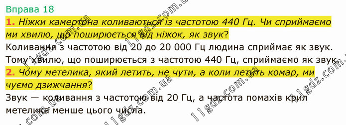 Ніжки камертона коливаються із частотою 440 Гц. Чи сприймаємо ми хвилю, що поширюється від ніжок, як звук? Коливання з частотою від 20 до 20 000 Гц людина сприймає як звук. Тому хвилю, що поширюється з частотою 440 Гц, сприймаємо як звук. 2. Чому метелика, який летить, не чути, а коли летить комар, ми чуємо дзижчання? Звук — коливання з частотою від 20 Гц, а частота помахів крил метелика менше цього числа.