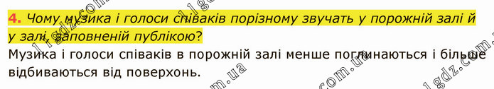 Чому музика і голоси співаків порізному звучать у порожній залі й у залі, заповненій публікою? Музика і голоси співаків в порожній залі менше поглинаються і більше відбиваються від поверхонь.