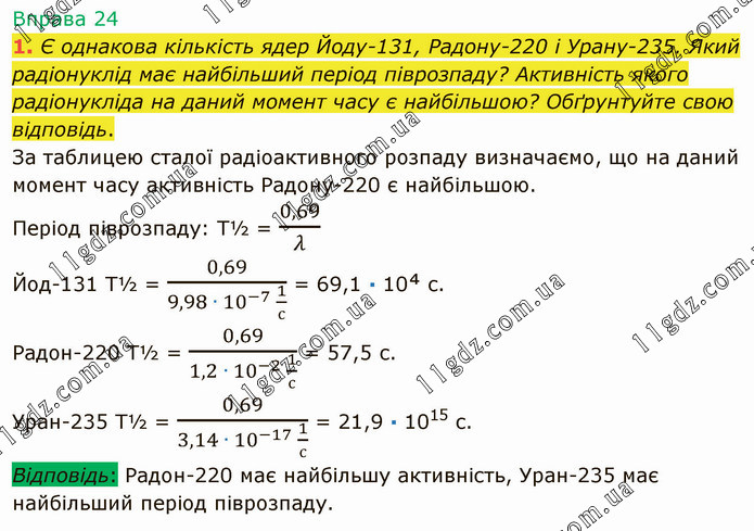 Є однакова кількість ядер Йоду-131, Радону-220 і Урану-235. Який радіонуклід має найбільший період піврозпаду? Активність якого радіонукліда на даний момент часу є найбільшою? Обґрунтуйте свою відповідь.