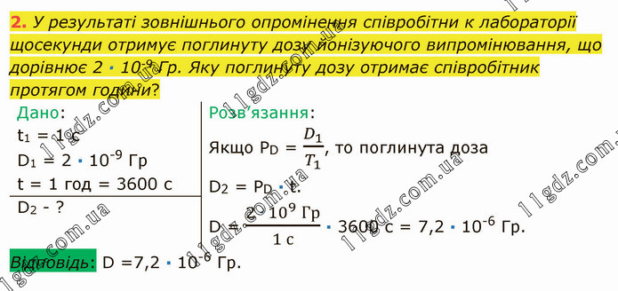 У результаті зовнішнього опромінення співробітни к лабораторії щосекунди отримує поглинуту дозу йонізуючого випромінювання, що дорівнює 2 ∙ 10-9 Гр. Яку поглинуту дозу отримає співробітник протягом години?