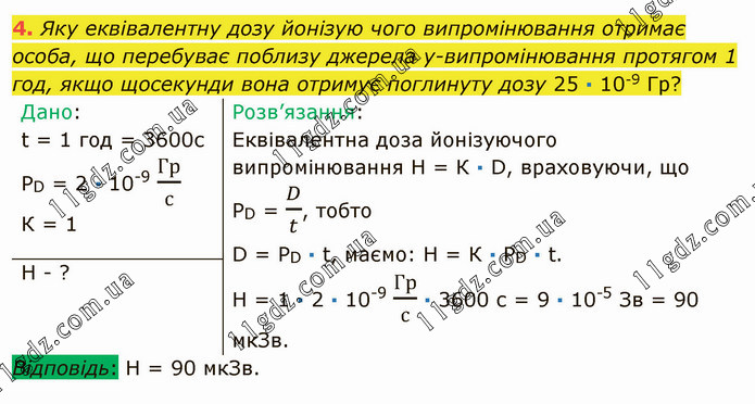 Яку еквівалентну дозу йонізую чого випромінювання отримає особа, що перебуває поблизу джерела у-випромінювання протягом 1 год, якщо щосекунди вона отримує поглинуту дозу 25 ∙ 10-9 Гр?