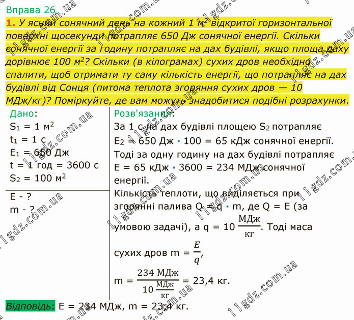 У ясний сонячний день на кожний 1 м2 відкритої горизонтальної поверхні щосекунди потрапляє 650 Дж сонячної енергії. Скільки сонячної енергії за годину потрапляє на дах будівлі, якщо площа даху дорівнює 100 м2? Скільки (в кілограмах) сухих дров необхідно спалити, щоб отримати ту саму кількість енергії, що потрапляє на дах будівлі від Сонця (питома теплота згоряння сухих дров — 10 МДж/кг)? Поміркуйте, де вам можуть знадобитися подібні розрахунки.