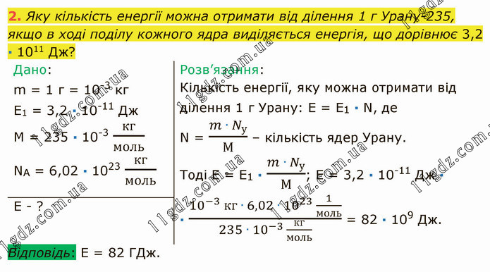 Яку кількість енергії можна отримати від ділення 1 г Урану-235, якщо в ході поділу кожного ядра виділяється енергія, що дорівнює 3,2 ∙ 1011 Дж?
