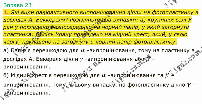 Які види радіоактивного випромінювання діяли на фотопластинку в дослідах А. Беккереля? Розгляньте два випадки: а) крупинки солі У ран у покладено безпосередньо на чорний папір, у який загорнута пластинка; б) сіль Урану покладено на мідний хрест, який, у свою чергу, покладено на загорнуту в чорний папір фотопластинку. а) Папір є перешкодою для α -випромінювання, тому на пластинку в дослідах А. Бекереля діяли γ -випромінювання або β –випромінювання. б) Мідний хрест є перешкодою для α -випромінювання та β –випромінювання. Тому, в цьому випадку, на фотопластинку діяло γ –випромінювання.