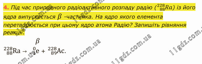 Під час природного радіоактивного розпаду радію ((_88^228)Ra) із його ядра випускається β -частинка. На ядро якого елемента перетворюється при цьому ядро атома Радію? Запишіть рівняння реакції.