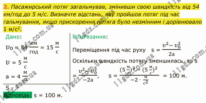 Пасажирський потяг загальмував, змінивши свою швидкість від 54 км/год до 5 м/с. Визначте відстань, яку пройшов потяг під час гальмування, якщо прискорення потяга було незмінним і дорівнювало 1 м/с2.