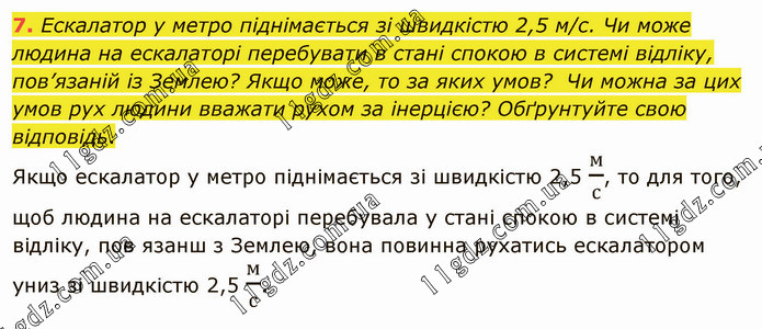 Ескалатор у метро піднімається зі швидкістю 2,5 м/с. Чи може людина на ескалаторі перебувати в стані спокою в системі відліку, пов’язаній із Землею? Якщо може, то за яких умов? Чи можна за цих умов рух людини вважати рухом за інерцією? Обґрунтуйте свою відповідь.